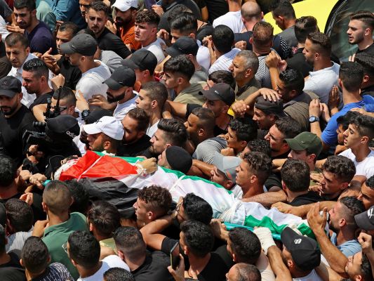 Ratusan pelayat berkumpul di Nablus untuk prosesi pemakaman tiga orang tewas. Beberapa militan menembak ke udara saat jenazah-jenazah itu dibawa melewati kerumunan.