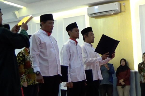 ANTARA – Tiga Warga Binaan Pemasyarakatan (WBP) tindak pidana terorisme di Lapas Kelas IIA Yogyakarta menyatakan ikrar setia kepada Negara Kesatuan Republik Indonesia (NKRI), Kamis (9/11). Ketiganya menyatakan bahwa Pancasila dan UUD 1945 tidak bertentangan dengan pemahaman agama yang mereka yakini. (Imam Prasetyo Nugroho/Andi Bagasela/Gracia Simanjuntak)
