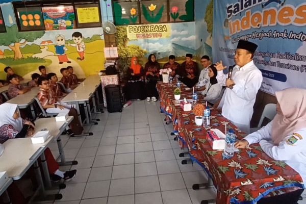 ANTARA – Forum Koordinasi Pencegahan Terorisme (FKPT) Provinsi Banten, Rabu (22/11) menggelar sosialisasi pencegahan paham radikalisme dan terorisme menyasar di hadapan puluhan pelajar SD, Rabu (22/11). Sosialisasi ini diadakan dalam bentuk dongeng, bekerja sama dengan Badan Nasional Penanggulangan Terorisme atau BNPT. (Susmiatun Hayati/Yovita Amalia/Rinto A Navis)