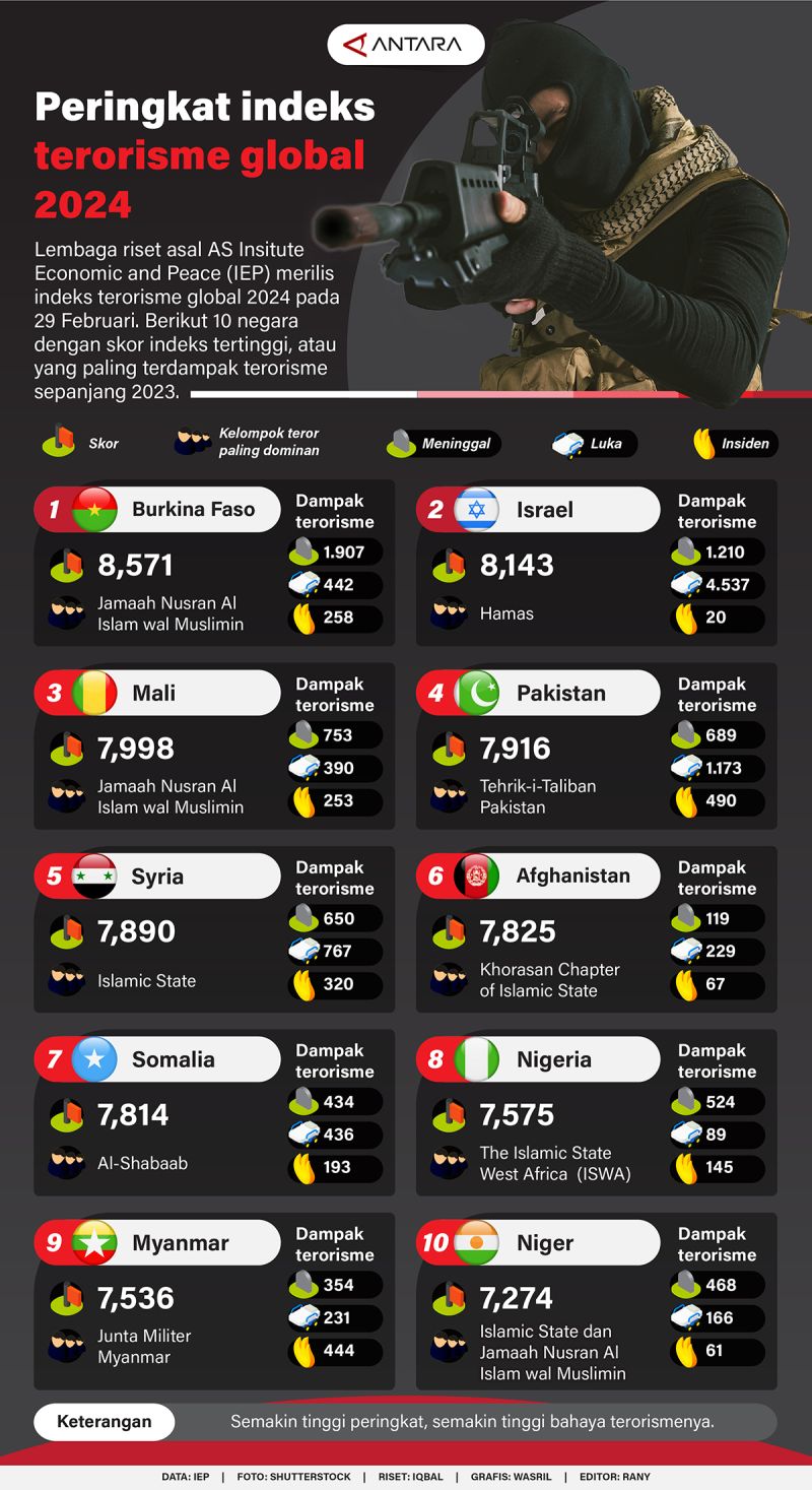 Lembaga riset asal AS Insitute Economic and Peace (IEP) merilis indeks terorisme global 2024 pada 29 Februari. …