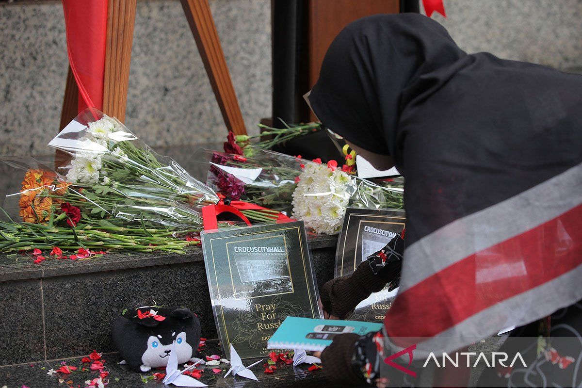 Seorang warga menaburkan bunga saat mengikuti aksi #PrayForRusia di Kedutaan besar Rusia, Jakarta, Jumat (29/3/2024). Aksi tersebut sebagai bentuk rasa belasungkawa, keprihatinan, dan simpati terhadap korban meninggal dan terluka dalam serangan mematikan di gedung konser di wilayah Moskow beberapa waktu lalu. ANTARA FOTO/Reno Esnir/Spt.