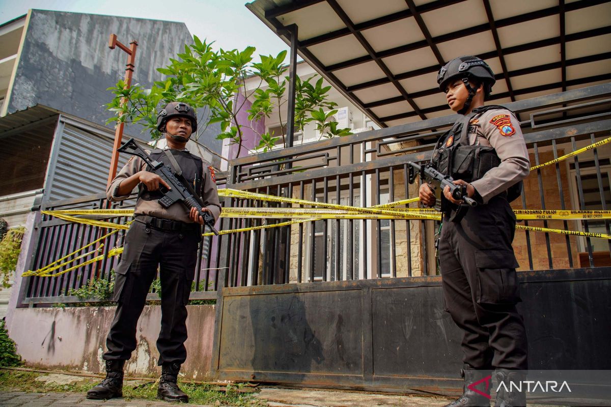 Polisi berjaga di depan rumah kontrakan terduga teroris di Desa Junrejo, Kecamaan Junrejo, Batu, Jawa Timur, Kamis (1/8/2024). Tim gabungan Densus 88 dan Polda Jatim berhasil mengamankan sejumlah barang bukti dari terduga teroris yakni bahan kimia pembuat bahan peledak (handak), peralatan pembuat handak, dan pembungkus bom untuk proses penyidikan lebih lanjut. ANTARA FOTO/Irfan Sumanjaya/aww.