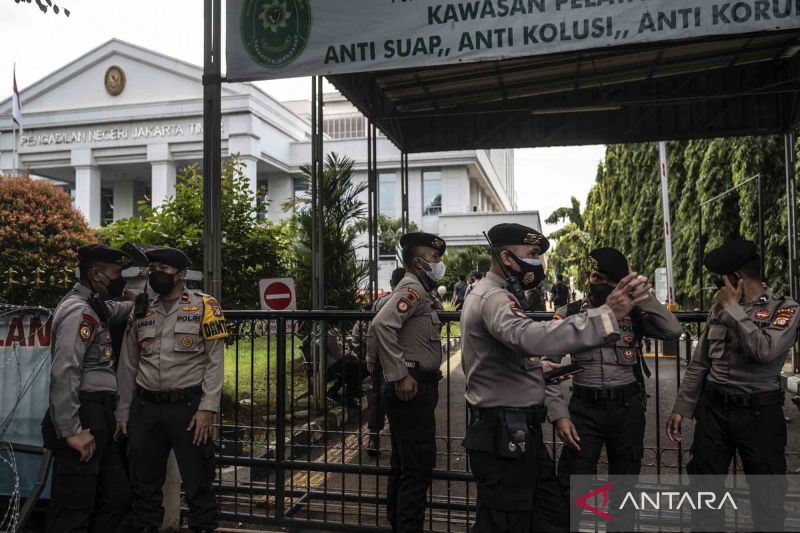 Personel kepolisian berjaga saat sidang putusan kasus terorisme dengan terdakwa mantan Sekretaris Umum FPI Munarman di Pengadilan Negeri Jakarta Timur, Jakarta, Rabu (6/4/2022). Majelis Hakim Pengadilan Negeri Jakarta Timur menjatuhkan vonis tiga tahun penjara kepada Munarman karena terbukti secara sah dan meyakinkan telah melakukan tindak pidana terorisme. ANTARA FOTO/Aprillio Akbar/wsj.